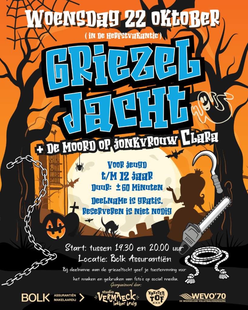 Woensdag 22 oktober 2025 organiseren wij weer een spannende Griezeljacht. De griezeljacht is voor jeugd t/m 12 jaar en duurt ongeveer 60 minuten. Deelname is gratis en reserveren is niet nodig.