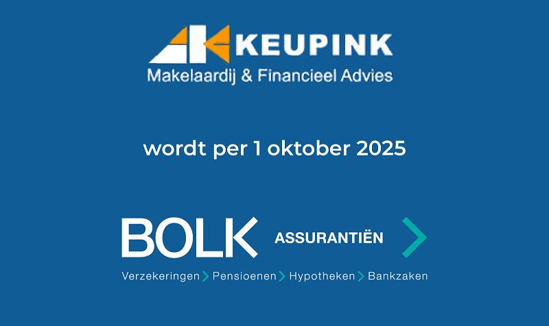 Per 1 oktober 2025 wordt Keupink Makelaardij & Financieel Advies overgevoerd naar Bolk Assurantiën. Wij verwelkomen Freek Keupink van harte als nieuwe collega en verheugen ons op een prettige en succesvolle samenwerking.